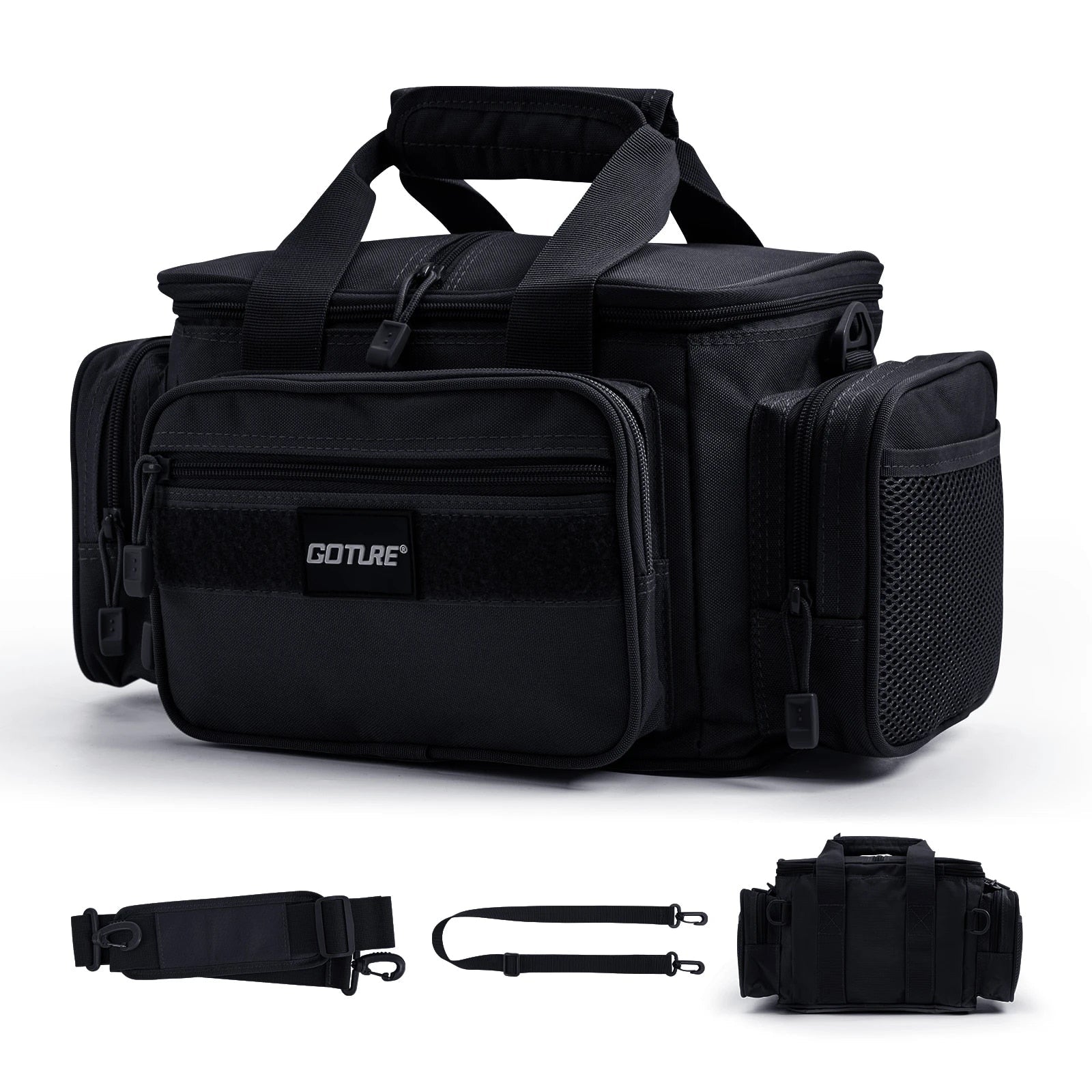 Bolsa de pesca multifuncional fabricada com materiais duráveis e costuras reforçadas, projetada para transportar equipamentos em diferentes condições ambientais. Conta com compartimentos internos amplos e divisórias organizadoras para armazenamento de iscas, anzóis, linhas, carretilhas e acessórios diversos.