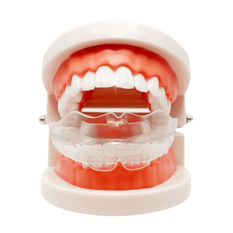 Posiciona os dentes de forma correta, acaba com estalos no maxilar ao abrir e fechar a boca, elimina o cansaço no rosto, língua e gengiva;