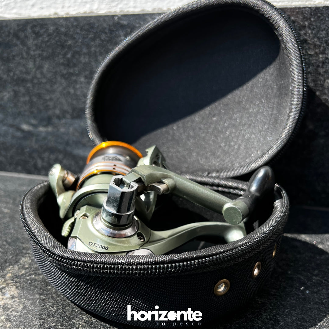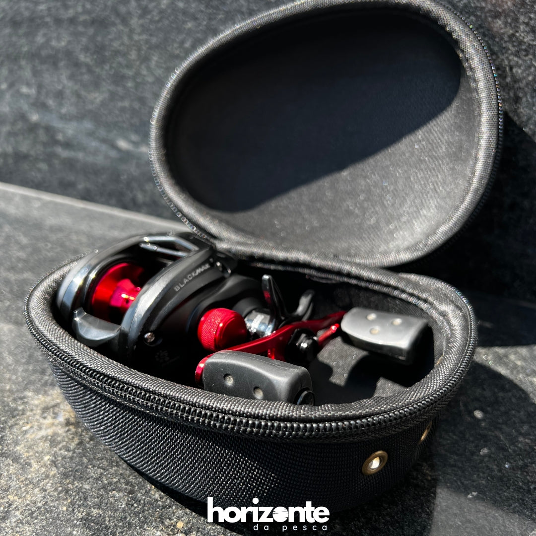 Bolsa para carretilha de pesca com dimensões aproximadas de 12,5 × 15,5 × 8,5cm, fabricada em EVA com revestimento externo em náilon resistente à água. Projetada para proteger o carretel contra impactos, arranhões e desgaste durante o transporte ou armazenamento.