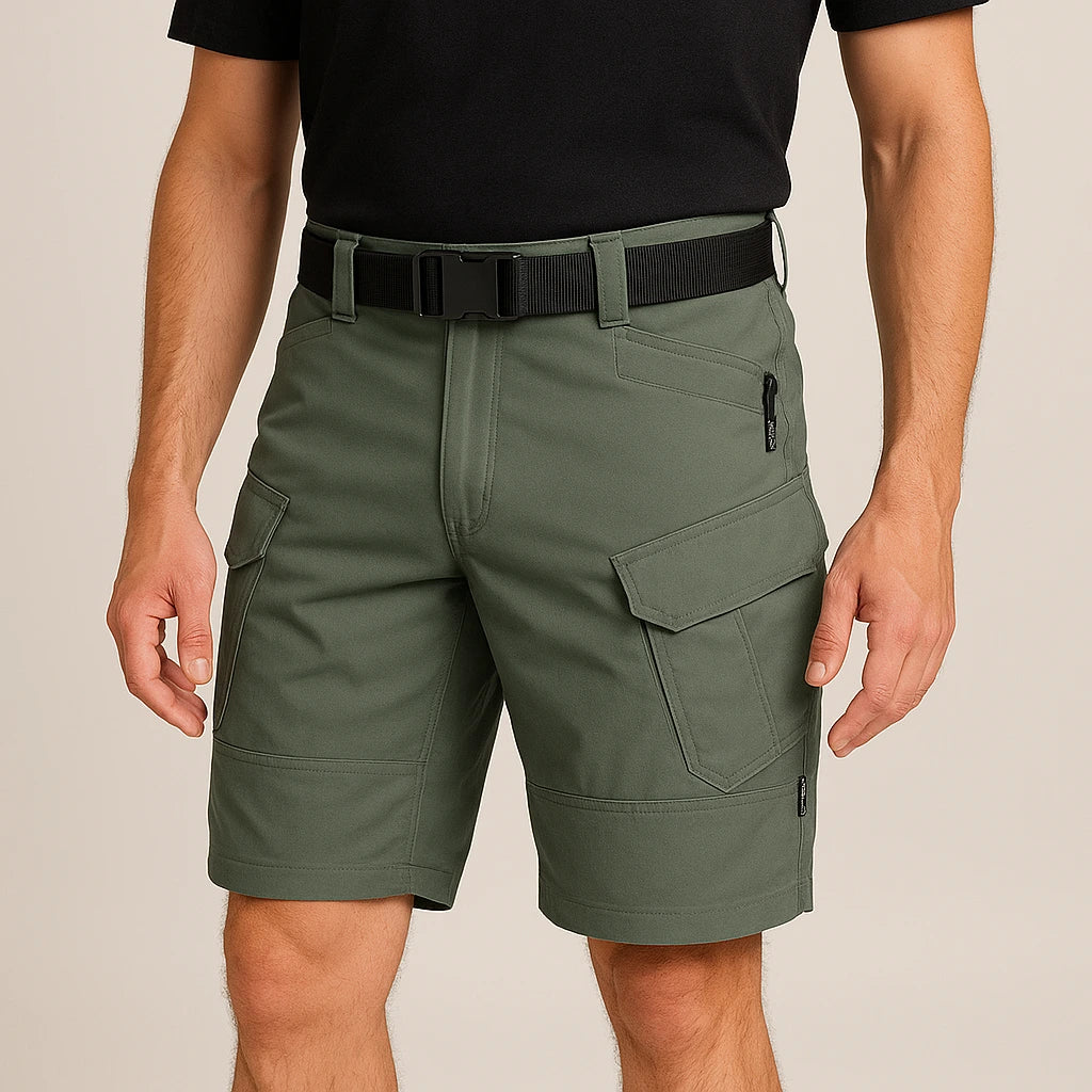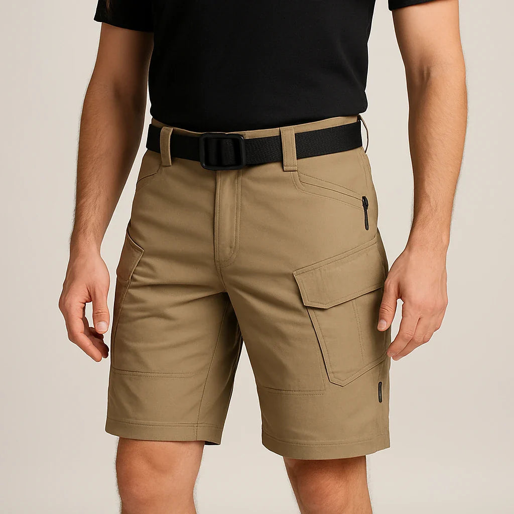 Bermuda tática confeccionada em tecido IX7 de poliéster, reconhecido por sua alta resistência a rasgos, perfurações e abrasões, utilizado em equipamentos de forças táticas. Estrutura reforçada com costuras duplas e camadas extras nas áreas de maior atrito, como a região dos joelhos.